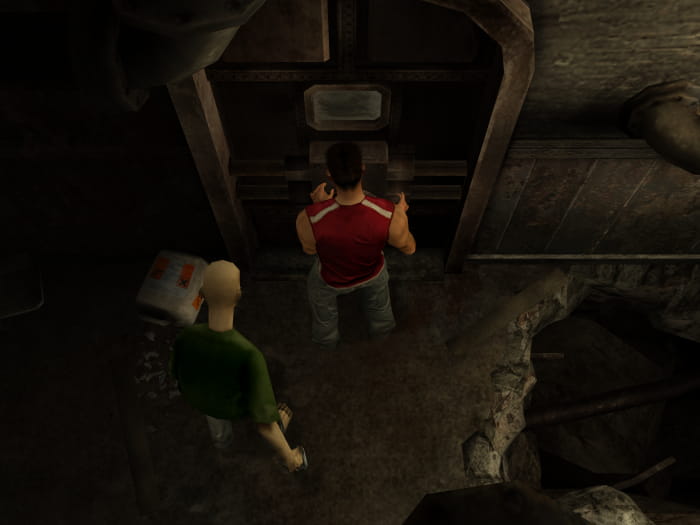 Nach der Cutscene werdet ihr Kenny steuern. Wechselt zu eurem Partner und nehmt mit diesem den Metallstab auf. Wechselt dann zu Kenny zurück und verwendet den soeben aufgehobenen Stab, um vom Käfig aus den Schalter zu aktivieren. Sind alle befreit, holt ihr euch den Bolzenschneider und öffnet die Truhe um euer Zeugs zu bergen. Verlasst den Raum und begebt euch an das Ende des Ganges. Ein voll entwickelter Mutant wird euch den Weg abschneiden. Am Ende des Ganges stellt ihr euch auf den kleinen Käfig und benutzt den Metallstab, um die Leiter herunterzuholen. Mit dieser gelangt ihr zurück ins Freie.