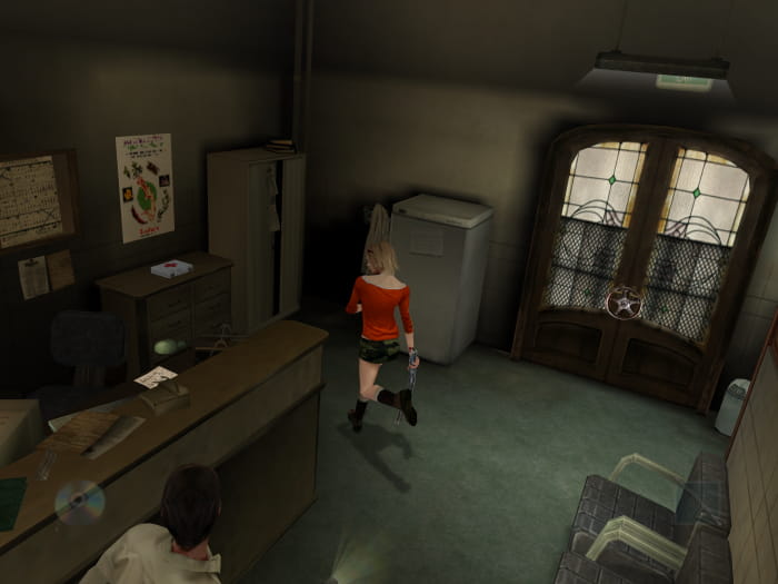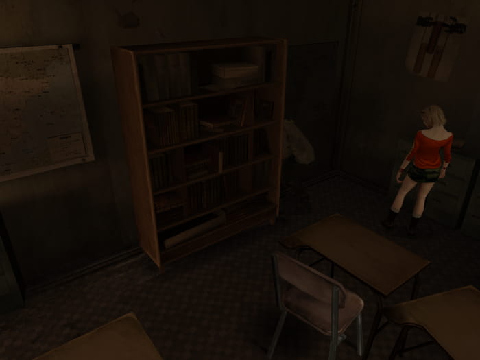 Da nun das Licht an ist, lässt sich die Caféteria frei erforschen, ohne das irgendwelche Viecher ständig respawnen. Ihr findet neben der automatischen Pistole Heilmittel und Munition. Sobald ihr fertig mit erkunden seid, betretet ihr den Raum von Ms. Wickson, welcher sich hinter dem Fundort der Schachtel mit Sicherungen befindet. Ihr findet dort eine CD, ein Erste-Hilfe-Set und an der Tür das Rad. Verlasst die Caféteria und begebt euch erneut in das Verwaltungsgebäude im Süden der Schule.