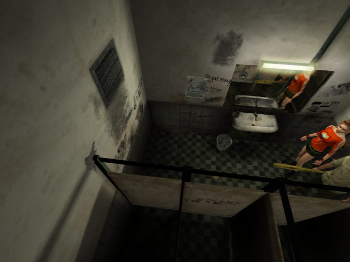 Begebt euch zurück ins Erdgeschoss und sucht den Gang mit den Toiletten auf. Gegenüber diesen könnt ihr in einem Raum Klebeband finden. Anschließend betretet ihr das WC der Herren. Dort stinkt es brutal und ihr findet einen Energy Drink. Nebenan ist die Toilette für Frauen, welches ein wenig sauberer wirkt. Helft eurem Partner am Ventilationsschacht hinauf und öffnet diesen mit eurem Schraubendreher. Durch den Schacht gelangt ihr auf das Klo der Lehrer, wo es noch schöner aussieht. Verlasst das stille Örtchen und nehmt im Lehrerzimmer den rostigen Schlüssel an euch. Im Anschluss begebt ihr euch die Treppe hinauf und findet dort den Schlüssel für das Lehrerzimmer. Verlasst die Räumlichkeit durch die Tür nahe der Treppe.