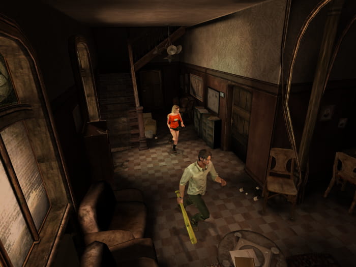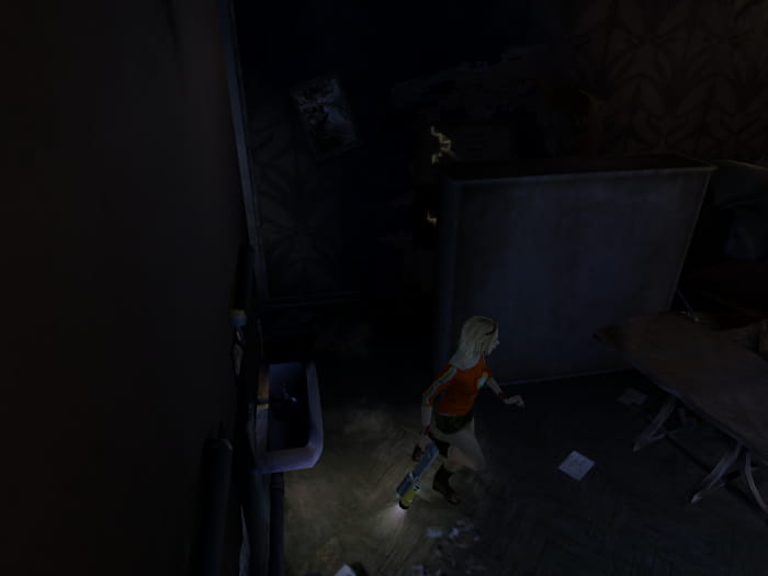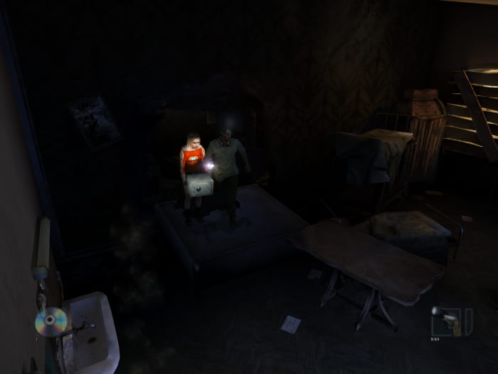 Ihr müsst den Gang zur anderen Seite durchqueren, allerdings ist der Boden brüchig. Lauft mit der Waffe zielend über den Boden, damit dieser nicht einbricht und euren Charakter in den Tod reißt. Auf der anderen Seite angelangt kommt ihr in einen Raum, in welchem ihr nach rechts geht. Schubst den Kleiderschrank in Richtung brüchiger Wand, um einen geheimen Raum freizulegen.