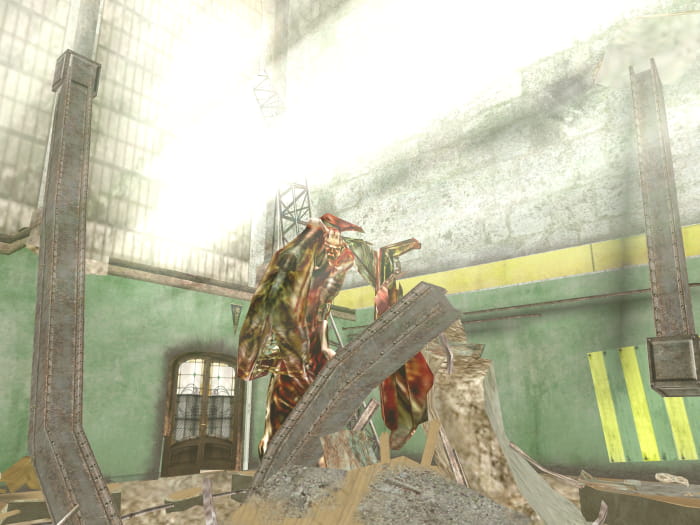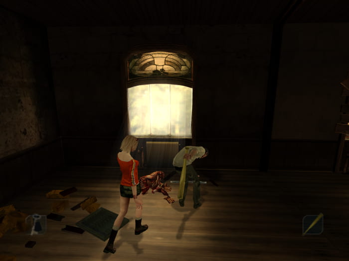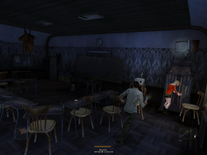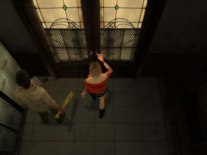 Ihr werdet zurück in der Eingangshalle sein. Lauft die Treppen hoch in das 2. Obergeschoss. Dort lässt sich eine Tür mit dem rostigen Schlüssel entsperren. Betretet den Raum, in welchem Monster erscheinen werden. Lauft zum Fenster und versucht dieses einzuschlagen. Es wird eine Cutscene abspielen, nach welcher ihr euch die Metallstange (stärker als Baseballschläger) am Fenster schnappt. Als nächstes verlasst ihr das Schulgebäude durch den nördlichen Ausgang.
