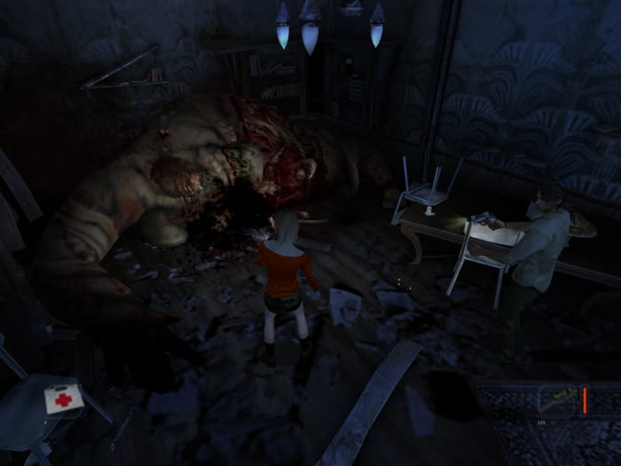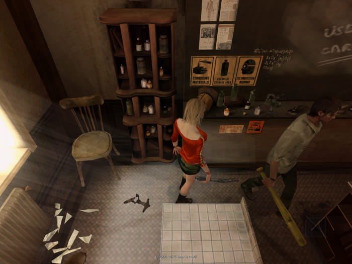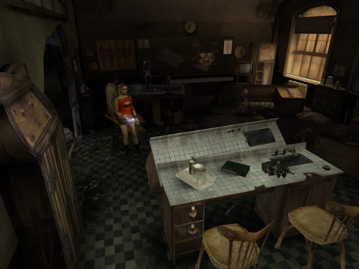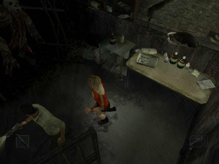 Zurück im Gang sprintet ihr am großen Mutanten vorbei zur Doppeltür und lauft die Treppe hinauf. Verwendet die Säure im Becher um die Kette an der Tür zu lösen. Bevor ihr durch die Tür geht, nehmt ihr das Klebeband im Regal neben euch auf. Lauft im Gang in Richtung Osten (in Richtung Kamera) und betretet den vordersten Raum. Bevor ihr in der Tasche eine Kompassnadel an euch nehmt, zerstört ihr das Fenster um ein wenig Licht in den Raum zu bringen, da beim Aufsammeln der Nadel Monster erscheinen werden.