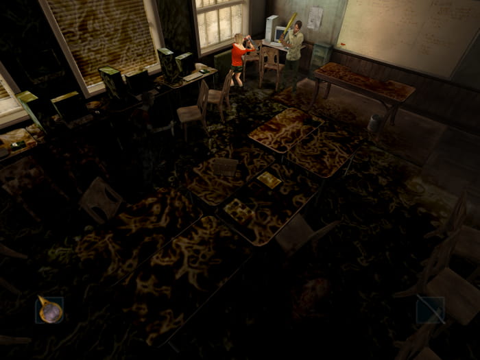Am Schulhof angelangt findet ihr eine CD auf einer Bank südlich eurer Position. Schlagt als nächstes den Weg nach Südwesten zu den Klassenräumen ein. Im Flur findet ihr sogleich rechts einen Aluminiumschläger (stärker als Metallstange). In einem Getränkeautomaten auf der linken Seite findet ihr einen Energy Drink. Am Anfang des Flurs betretet ihr auf der linken Seite einen Raum, in welchem ihr Stan findet. Dort schnappt ihr euch drei Pappbecher und kehrt in den Flur zurück.