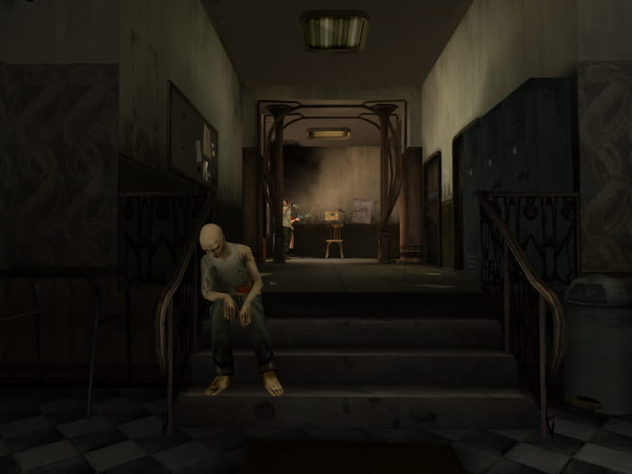 Lauft den Gang entlang, erledigt die beiden Mutanten und entnehmt einem Spind einen Energy Drink. In einem Regal steht die Statue #1, die ihr einsammeln müsst. Betretet die Toiletten um weitere Heilmittel zu finden. Am Ende des Ganges betretet ihr den Raum zu eurer Rechten. Lauft in Richtung Kamera und sammelt die Lichtgranate vom Bett auf. Verlasst den Raum schnell wieder, um nicht von den Gegnern vermöbelt zu werden. Im Anschluss begebt ihr euch in das Stockwerk über euch.