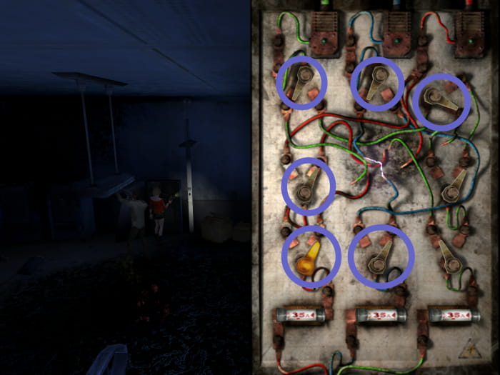 In der Caféteria weicht ihr den Gegnern aus oder erledigt sie und lauft zur Treppe. Geht diese hinauf und erschießt die Gegner im Obergeschoss. Lauft dann zu der Doppeltür auf der anderen Seite des Raumes, um durch diese die Küche zu betreten. Anschließend lauft ihr durch die Tür zu eurer Linken. Ein großer Mutant wird im darauffolgenden Raum neben einer Box mit Sicherungen liegen. An der Decke hängt zudem noch ein Monster. Nehmt die Sicherungen an euch und kehrt über die Küche zurück in den Raum, welchen ihr zuvor über die Treppe erreicht habt. Die Gegner werden zu diesem Zeitpunkt erneut erschienen sein. Erledigt sie von neuem, öffnet den Elektroschrank mit dem Schraubendreher, setzt die Sicherungen in den Schrank ein und aktiviert jeden Schalter wie auf dem Bild markiert jeweils ein mal.