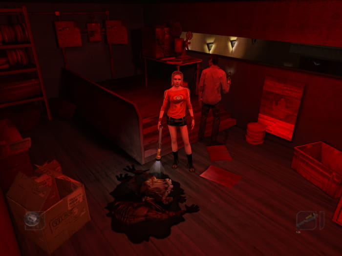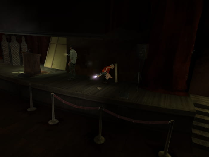 Kehrt zur Lobby zurück und lauft den Gang bis nach hinten. Dort gibt es eine nach oben führende Treppe. Folgt dem Weg in den Projektorraum. Seid jedoch gewarnt – euch werden zwei kleine Mutantenviecher angreifen. Ihr findet Munition für die Schrotflinte und könnt das Filmband in den Projektor einlegen. Das Einlegen dieses Filmbands ist jedoch für den weiteren Spielverlauf nicht notwendig. Anschließend kehrt ihr in das Auditorium zurück und geht durch die nahegelegene Tür. Ihr erreicht eine Umkleide mit Munition für die Schrotflinte. Einen Raum weiter erreicht ihr die Backstage. In der Mitte des Raumes liegt Pistolenmunition.