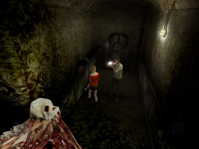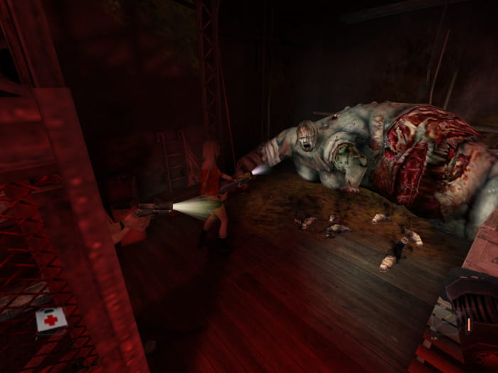 Sobald alle Statuen eingesetzt sind, geht ihr durch die Tür auf der linken Seite. Lauft den Gang entlang bis zur Kreuzung. Euch werden an dieser Stelle drei große Mutanten umzingeln. Nehmt die Lichtgranate nahe der Kreuzung und erledigt die Mutanten. Anschließend lauft ihr durch die Tür rechts der Kreuzung. Ihr findet einen winzigen Raum mit einer CD und vier Türen, von welchen zwei verschlossen sind. Geht durch die Tür rechts in der Ecke. Nehmt den Hebel und das Erste-Hilfe-Kit an euch und kehrt in den Raum mit dem dicken Monster zurück. Neben der Blobwoman findet ihr einen Schalter, welchen ihr mit dem Hebel betätigen könnt.