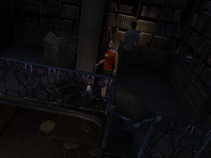 Lauft die Treppe hinauf und geht durch die nächstgelegene Tür. Ihr findet dort die Statue #3. Anschließend kehrt ihr um und lauft über die Treppen in das Obergeschoss des Bibliotheksgebäudes. Im Obergeschoss erledigt ihr die beiden Monster an der Decke. Sucht bei Bedarf nach der CD in einem Spind. Hinter der Tür im Westen gibt es drei Energy Drinks. Im nordwestlichen Raum bewacht ein voll entwickelter Mutant Schrotflintenmunition und einen Revolver. Im Raum im Norden findet ihr abgesehen von Gegnern Klebeband auf dem Tisch und eine Lichtgranate im verschlossenen Schrank. Im Nordosten findet ihr nochmals Klebeband und Pistolenmunition, ebenfalls bewacht von kleinen Monstern.