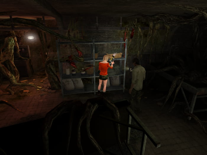 Ihr findet im Eingangsraum zum Keller eine CD. Verwendet den Hebel um die Leiter in den Keller freizulegen. Klettert hinab und durchlauft den Gang, wobei ihr euch von den beiden Monstern an der Decke in Acht nehmen solltet. Im nachfolgenden Raum gibt es zwei voll entwickelte Mutanten, welche ihr ausschaltet. Ihr findet einen Energy Drink zum Heilen. Setzt euren Weg in das nächste Zimmer fort. Anschließend lauft ihr durch die Tür links. Lauft die Treppe nach oben, sammelt eine CD, einen Energy Drink und Klebeband auf und begebt euch durch die obere Tür.