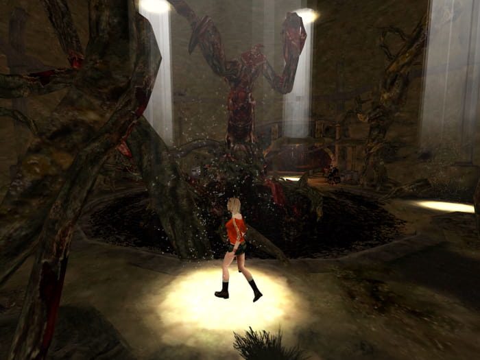 Lauft zurück in den Raum mit der Leiter. Klettert hinauf und geht durch die Tür auf der rechten Seite. In Waldens Tasche findet ihr Heilmittel und Munition. Betretet den großen Raum, nach Möglichkeit mit Ashely, um den Kampf gegen den Endboss zu starten. Solltet ihr alleine spielen, so lasst den zweiten Charakter im Raum zuvor stehen. Schießt die Ranken, mit denen er sich an der Decke hält, kaputt. Ihr macht wie auch bei allen anderen Gegnern in diesem Spiel, mehr Schaden, wenn ihr auf die Ranken Licht werft. Habt ihr eines zerstört, wird die Decke an einer Stelle zerstört und ein Lichtfleck wird erscheinen. Stellt euch unbedingt, nachdem ihr eines dieser Ranken zerstört habt, in das Licht, um nicht Opfer eines Instant Kills zu werden. Sind alle Ranken zerstört, wechselt der Kampf in die Turnhalle und zu Phase 2. Weicht seinen Attacken aus und wartet bis das Licht ihn erledigt hat. Er stöhnt immer rum bevor er euch mit einer unausweichlichen Attacke angreift. Um diese abzubrechen, schießt ihm ins Gesicht.